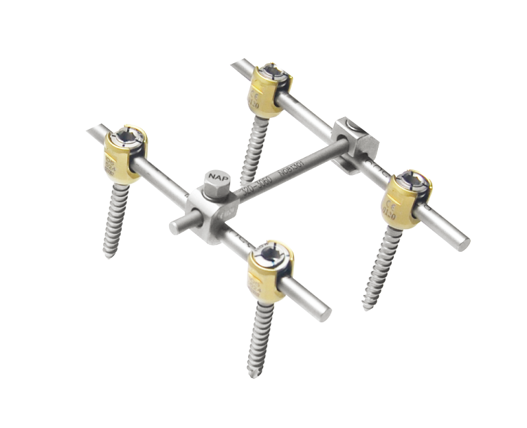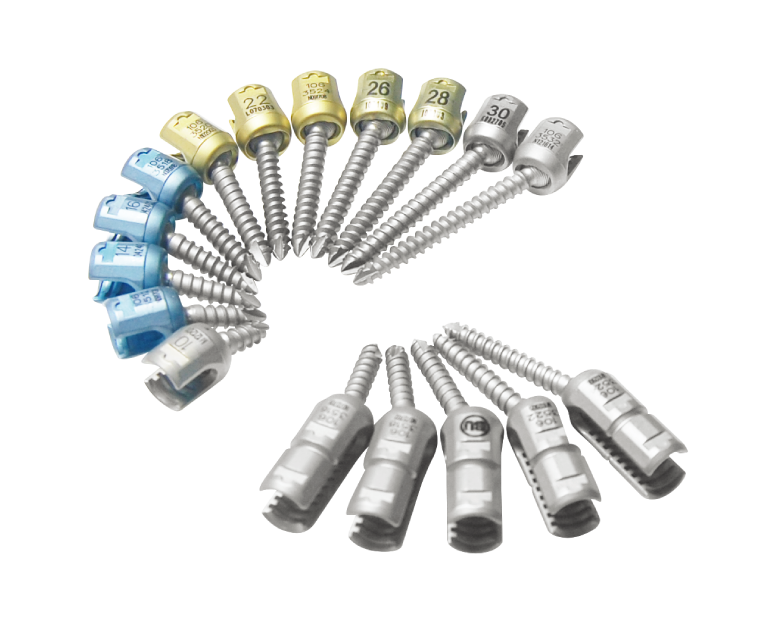 本固定系统万向多轴,上方置入,置杆更容易,40°内外向,80°头尾向,两侧滑槽设计配上特殊复位器械让复位更容易。
